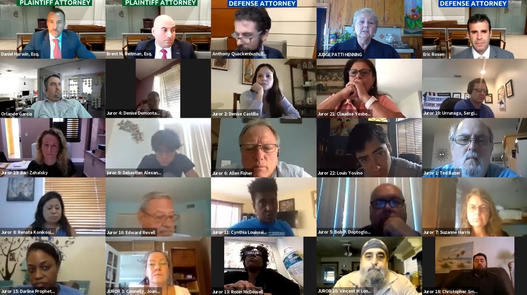 The jurors were asked, “Do you feel you could participate in a jury trial and render a fair verdict if the trial was conducted completely on video?” “Would you rather attend jury duty this way as opposed to in the courthouse practicing social distancing and wearing a mask?” “Do you feel you may be distracted sitting as a juror in this format?” “Do you feel using this format you were not able to feel fully engaged in the jury selection?” “Do you feel you were limited in engaging in the process due to technology limitations i.e. Wi-Fi or equipment?” “Do you feel you may not be able to judge credibility of a witness over Zoom?” “In a personal injury case where the Plaintiff may have suffered catastrophic injuries do you feel you may not be able to award large sums of money as you may only see the injured person or their family for a limited time?”