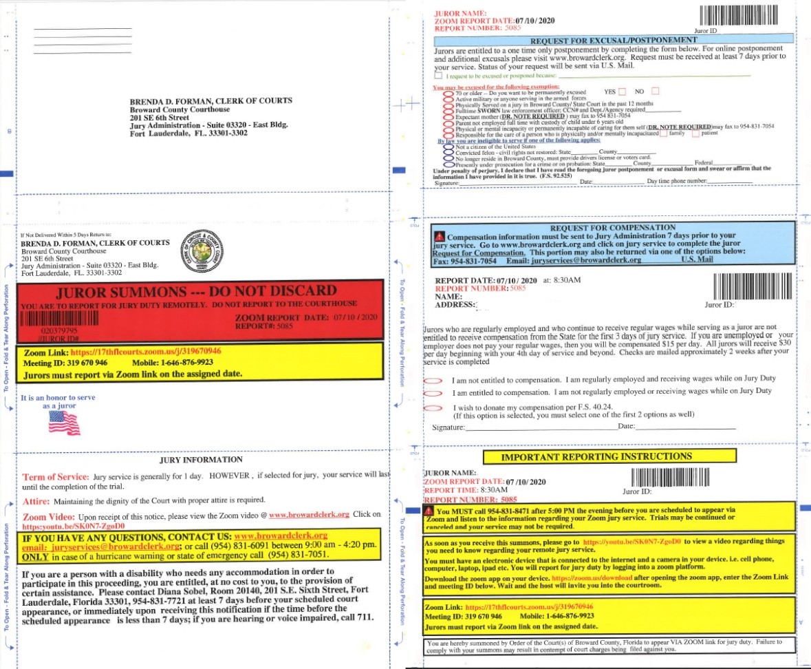 In the latter part of June 2020, 120 prospective jurors residing in Broward County, Florida, received a summons for jury duty. Like all summons in Florida, the prospective jurors received their notices for jury duty in the mail and were selected randomly by a computer using the Florida driver’s license data base.